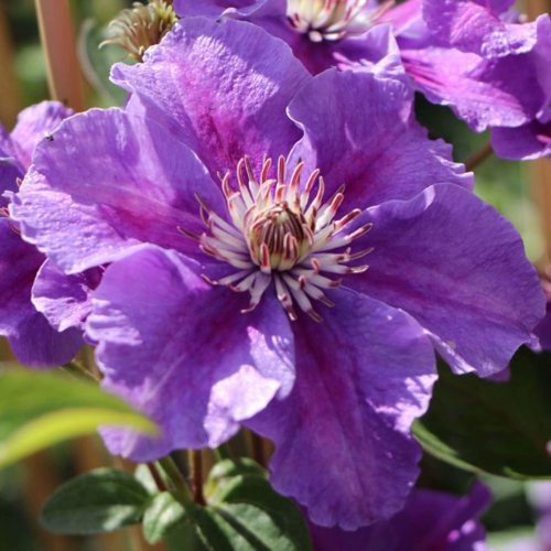 Цветки клематиса Ашва — это настоящее произведение искусства. Они изящные и благородные, крупного размера (диаметр 5-8 см) с округлой формой и шестью лепестками, которые своим почти круглым профилем и изогнутыми краями создают эффект лёгкости и воздушности. Пурпурно-фиолетовая окраска лепестков, украшенная красной полоской посредине и более тёмным основанием, придаёт растению особую индивидуальность. Тычинки бело-розового цвета прекрасно подчеркивают многообразие окраски. Аромат цветков сладкий и интенсивный, что делает клематис не только визуально привлекательным, но и создаёт приятную атмосферу в вашем саду.