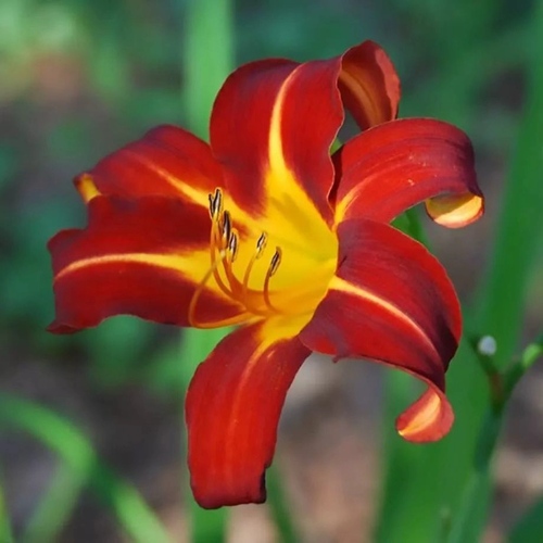 Отем Ред формирует компактный, структурированный куст высотой до 90 см. Листья — плотные, ремневидные, образуют аккуратный фон для крупных цветков. Диаметр каждого цветка достигает 12–13 см. Бутоны раскрываются в насыщенном бордово-красном цвете, а в центре — солнечное, почти светящееся золотисто-жёлтое горло. Такая контрастность смотрится максимально выразительно на фоне зелени и в срезке. Цветение приходится на июль–август и длится до 4 недель. В регионах с тёплым климатом возможна повторная волна бутонов к осени.